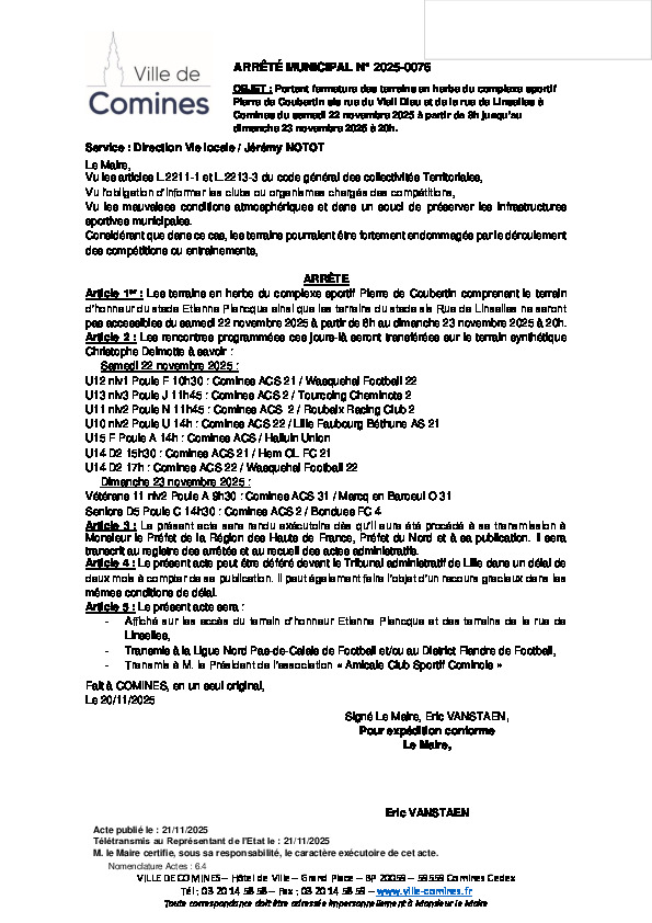 Fermeture des terrains en herbe au complexe sportif Pierre de Coubertin sis rue du Vieil Dieu et de la rue de Linselles à Comines les 22 et 23/11/2025