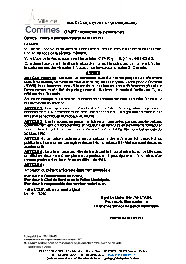 Travaux dans l'église St Chrysole - Règlementation de stationnement du 24/11 au 31/12/2025