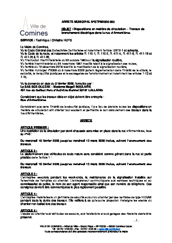 SAS SGE OLCZAK - Travaux de branchement électrique 46 rue d'Armentières du 18/02 au 13/03/2026 inclus