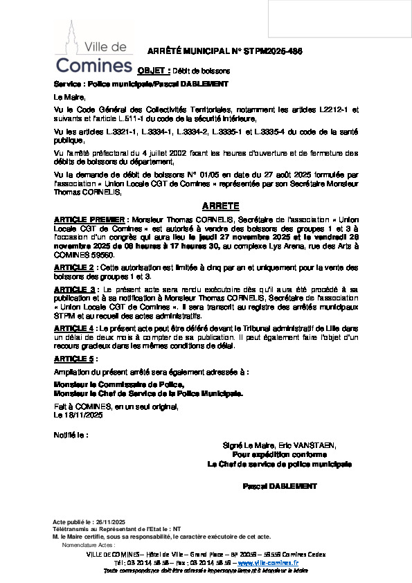Ouverture d'un débit de boissons par l'association Union Locale CGT de Comines les 27 et 28/11/2025