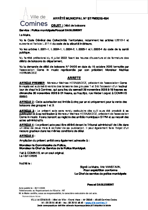 Ouverture d'un débit de boissons par l'association Come in music les 29 et 30/11/2025