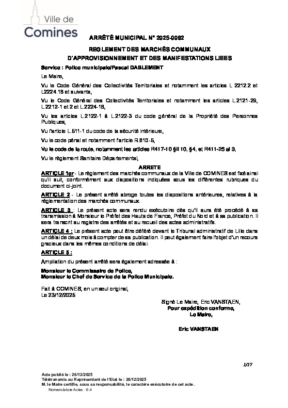 Règlement des marchés communaux d'approvisionnement et des manifestations liées