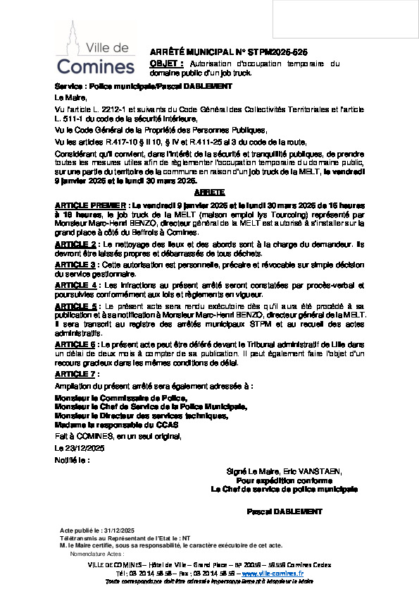 Autorisation d'occupation temporaire du domaine public d'un job truck le 09/01 et le 30/03/2026