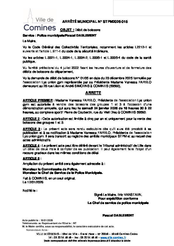 Ouverture d'un débit de boissons par Lys Union Gym le 24/01/2026