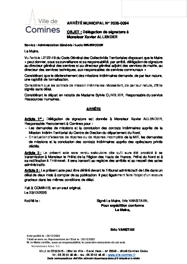 Délégation de signature à Xavier ALLENDER, responsable recrutement