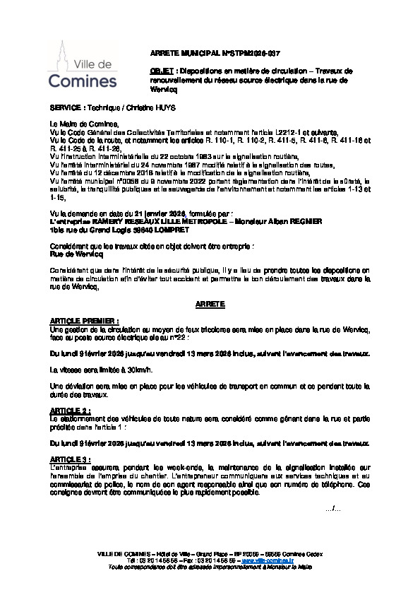 ETS RAMERY RESEAUX LILLE METROPOLE - Travaux de renouvellement du réseau source électrique rue de Wervicq du 09/02 au 13/03/2026 inclus