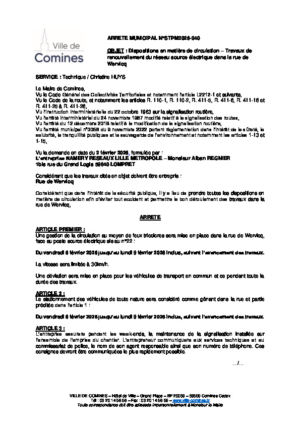 ETS RAMERY RESEAUX LILLE METROPOLE - Travaux de renouvellement du réseau source électrique rue de Wervicq du 06 au 09/02/2026 inclus