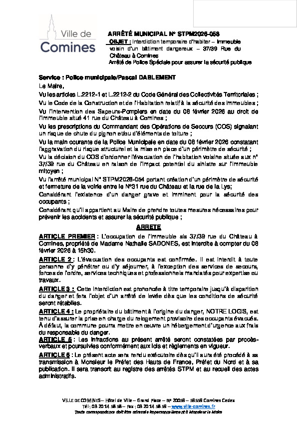 Interdiction temporaire d'habiter l'immeuble 37/39 rue du Château voisin d'un bâtiment dangereux à compter du 08/02/2026 jusqu'à disparition du danger
