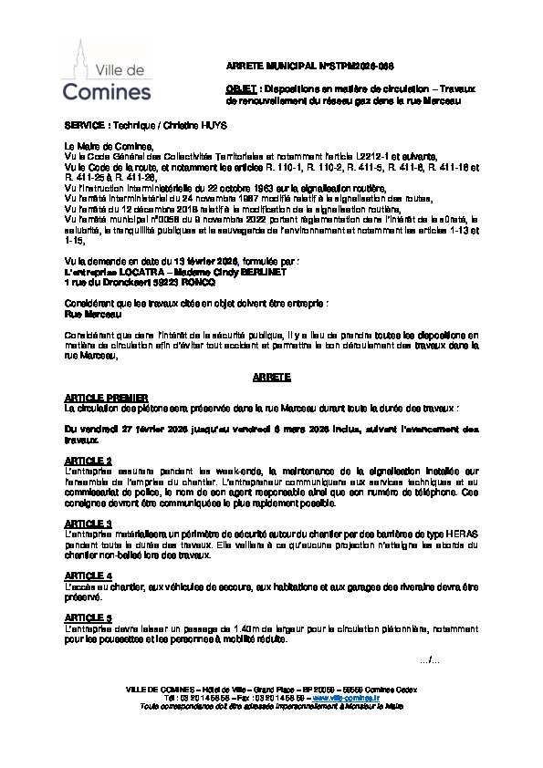 ETS LOCATRA - Prolongation d'arrêté pour travaux de renouvellement du réseau gaz dans la rue Marceau du 27/02 au 06/03/2026 inclus