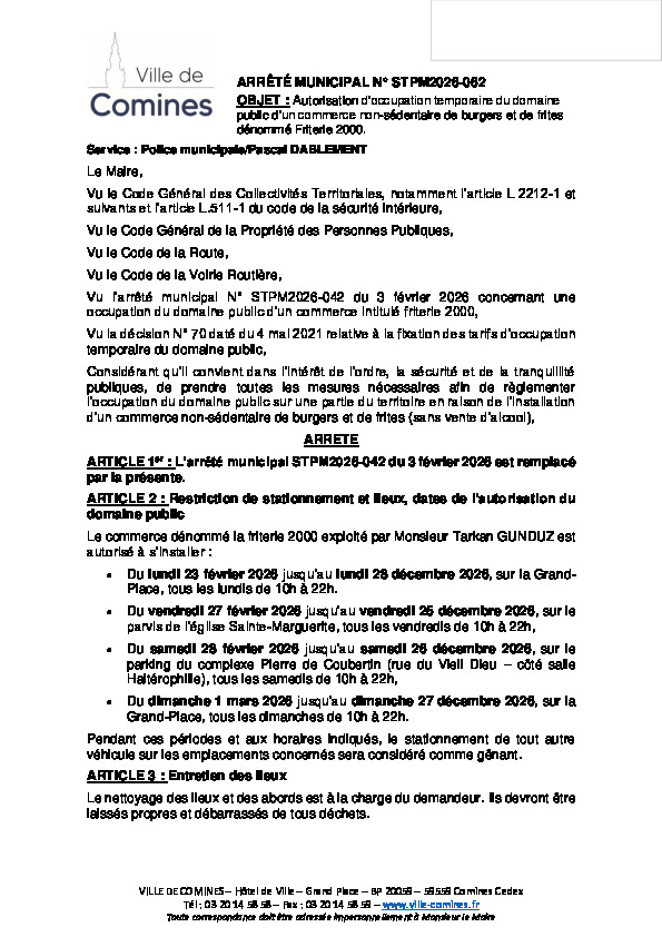 Autorisation d'occupation temporaire du domaine public d'un commerce non-sédentaire de burgers et de frites dénommé Friterie 2000 du 23/02 au 27/12/2026