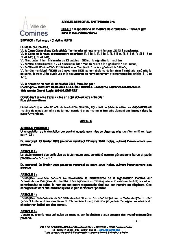 ETS RAMERY RESEAUX LILLE METROPOLE - Travaux gaz 133 rue d'Armentières du 25/02 au 27/03/2026 inclus