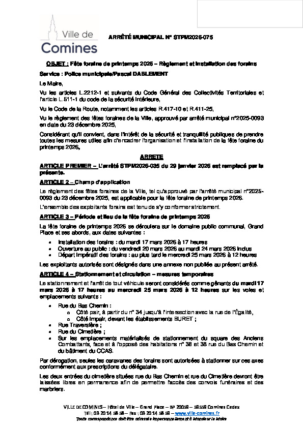 Fête foraine de printemps 2026 - Règlement et installation des forains