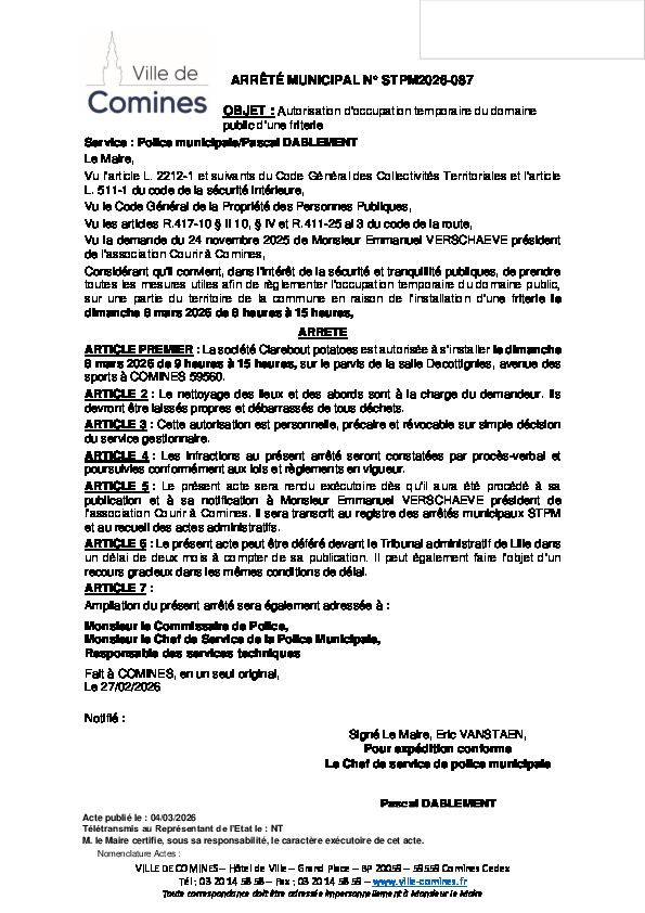 Autorisation d'occupation temporaire du domaine public d'une friterie le 08/03/2026