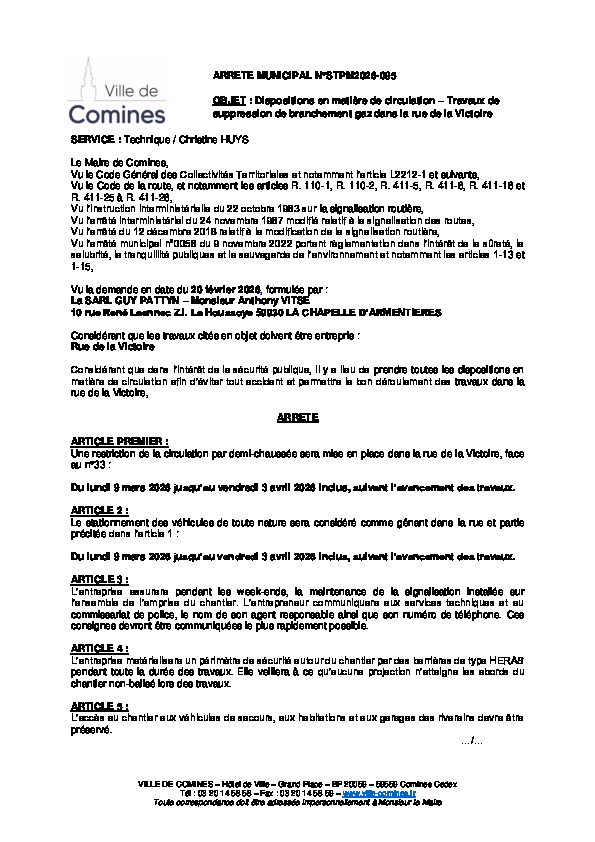 SARL GUY PATTYN - Travaux de suppression de branchement gaz 33 rue de la Victoire du 09/03 au 03/04/2026 inclus