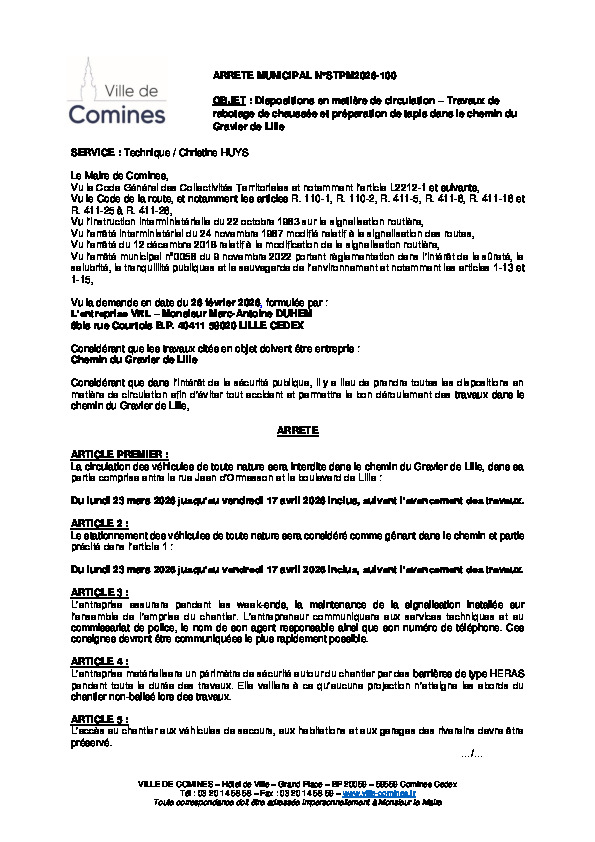 ETS VRL - Travaux de rabotage de chaussée et préparation de tapis dans le chemin du Gravier de Lille du 23/03 au 17/04/2026 inclus