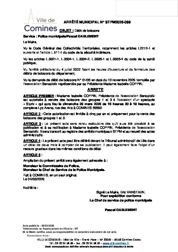 Ouverture d'un débit de boissons par l'association Sensafoliz le 29/03/2026