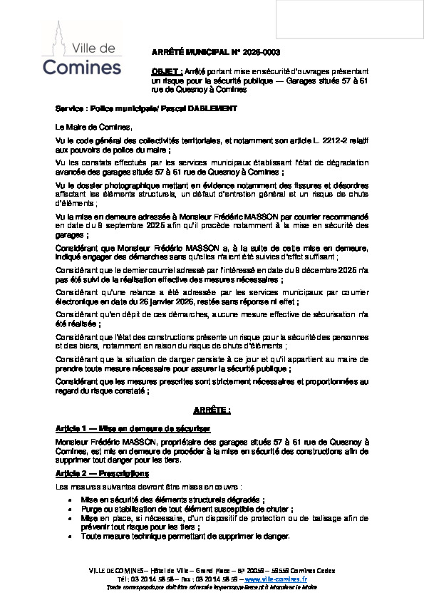 Mise en sécurité d'ouvrages présentant un risque pour la sécurité publique - Garages situés 57 et 61 rue de Quesnoy
