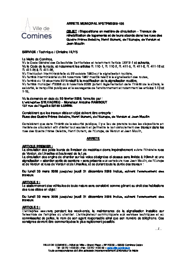 ETS SYLVAGREG - Travaux de réhabilitation de 102 logements et de leurs abords dans les rues des 04 Frères Delattre, Henri Dunant, de l'Europe, de Verdun et Jean Moulin du 30/03 au 31/12/2026 inclus