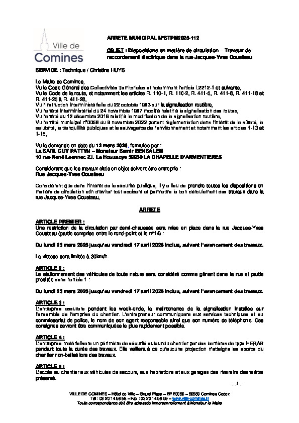 SARL GUY PATTYN - Travaux de raccordement électrique dans la rue Jacques-Yves Cousteau du 23/03 au 17/04/2026 inclus