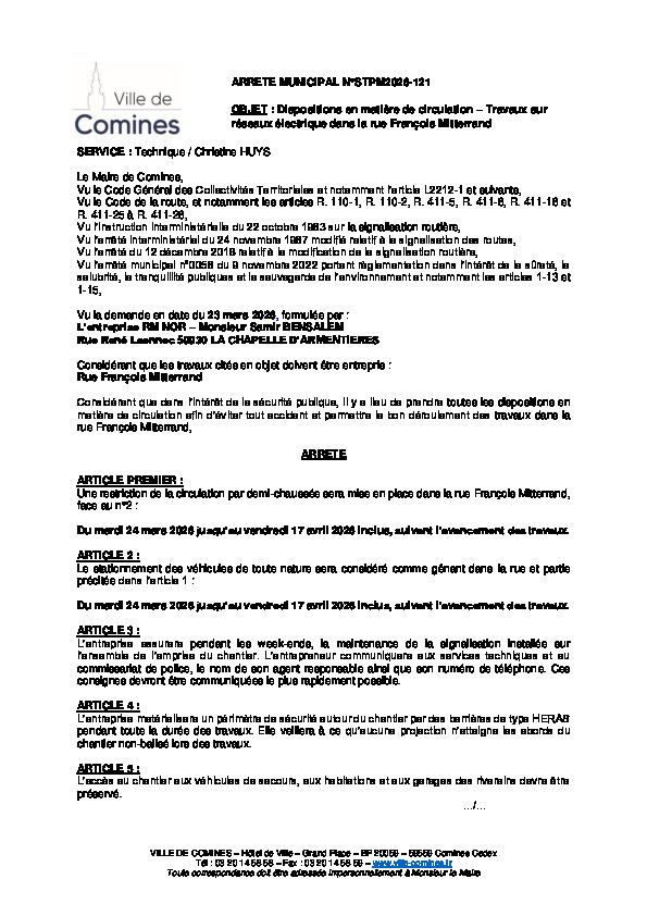 ETS RM NOR - Travaux sur réseau électrique 2 rue François Mitterrand du 24/03 au 17/04/2026 inclus