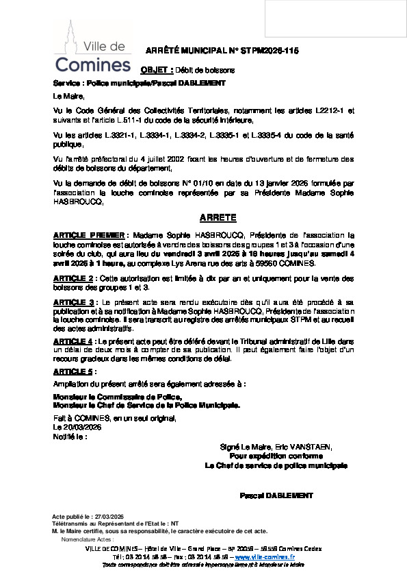 Ouverture d'un débit de boissons par l'association La louche cominoise les 03 et 04/04/2026