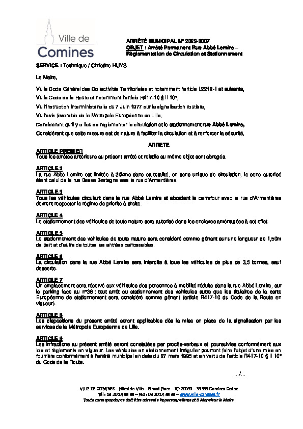 Règlementation de circulation et stationnement rue Abbé Lemire
