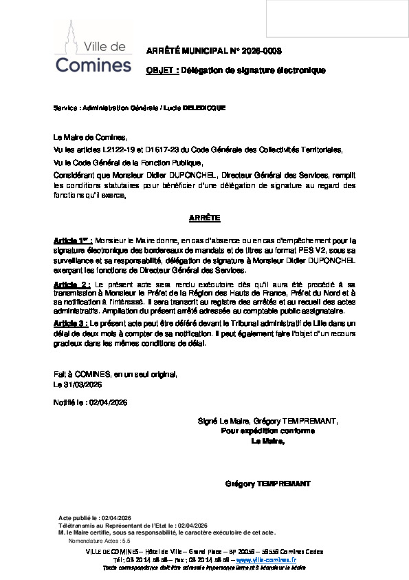 Délégation de signature électronique à Monsieur Didier DUPONCHEL