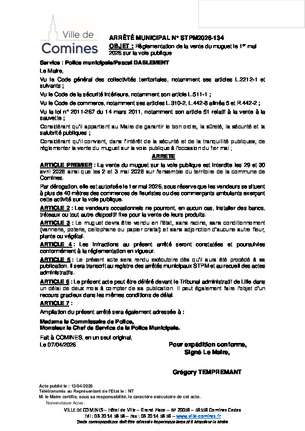 Règlementation de la vente du muguet les 29 et 30/04/2026 et les 02 et 03/05/2026 à l'occasion du 1er mai
