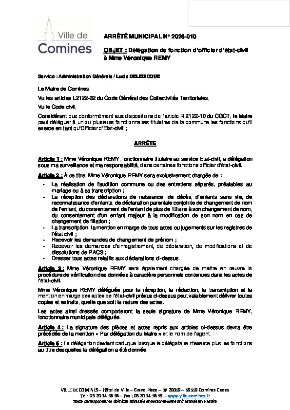 Délégation de fonction d'officier d'état-civil à Mme Véronique REMY