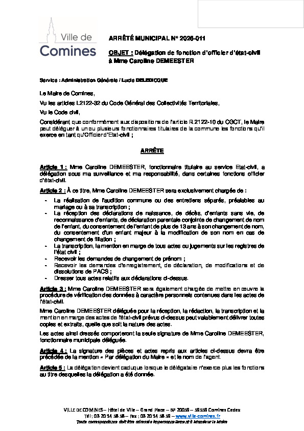 Délégation de fonction d'officier d'état-civil à Mme Caroline DEMEESTER