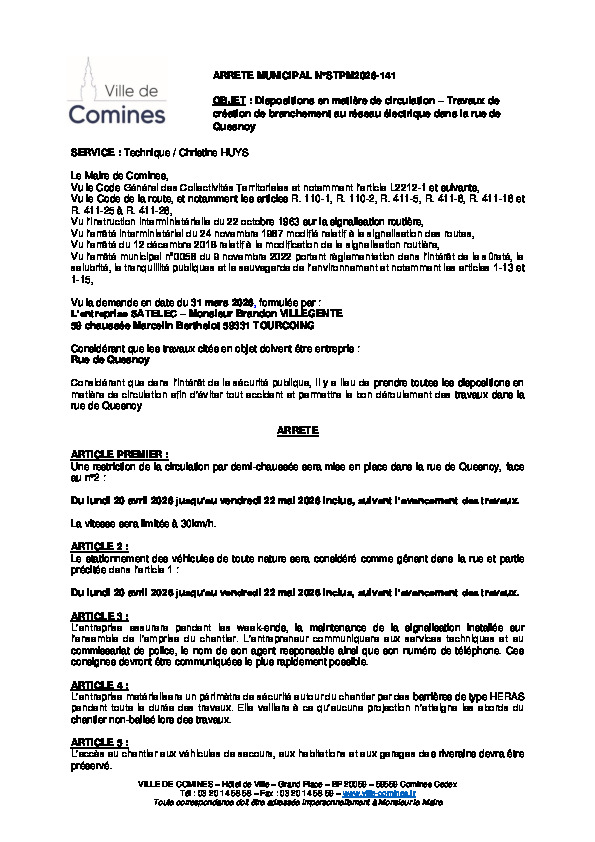 ETS SATELEC - Travaux de création de branchement au réseau électrique 2 rue de Quesnoy du 20/04 au 22/05/2026 inclus