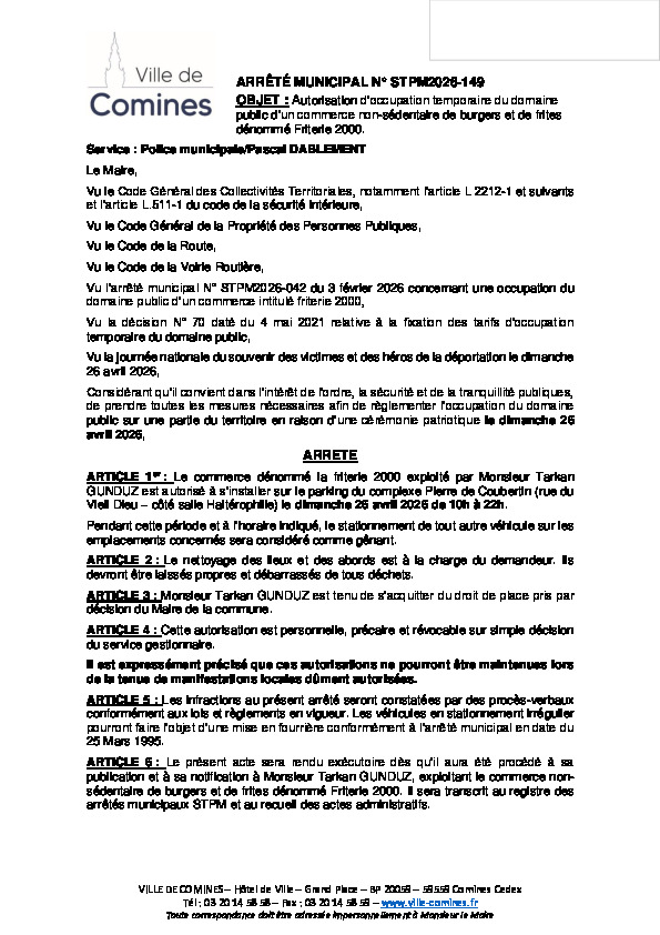 Autorisation d'occupation temporaire du domaine public d'un commerce non-sédentaire de burgers et de frites dénommé Friterie 2000 le 26/04/2026