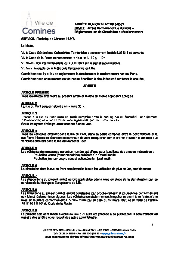 Fermeture provisoire de la voirie chemin vert à Comines (partie comprise entre les rues Molière et Pierre Mendès France) jusqu'au 07/11/2025