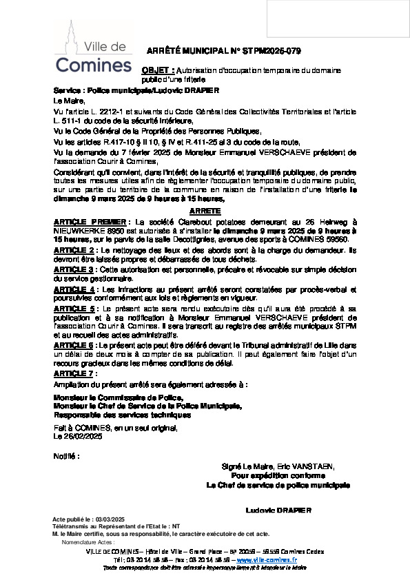 Autorisation d'occupation temporaire du domaine public d'une friterie de la société Clarebout le 19/10/2025